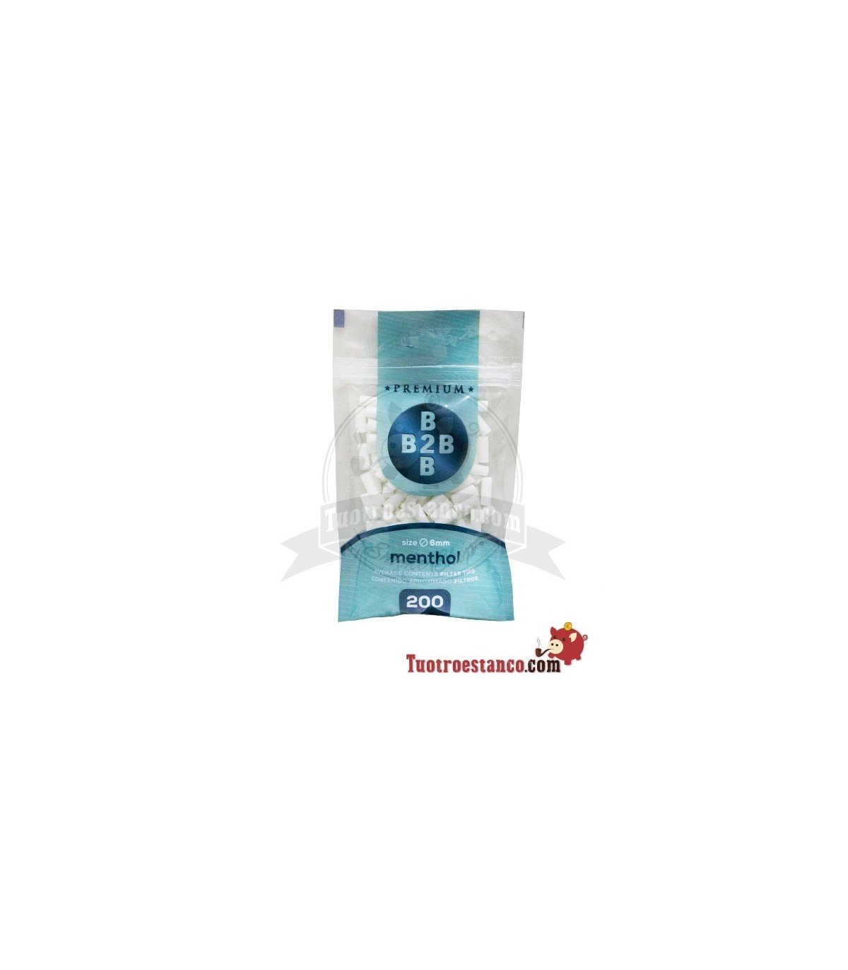 - 200 Mentholfilter mit einem Durchmesser von 6 mm in einem flexiblen Beutel mit Selbstverschluss.