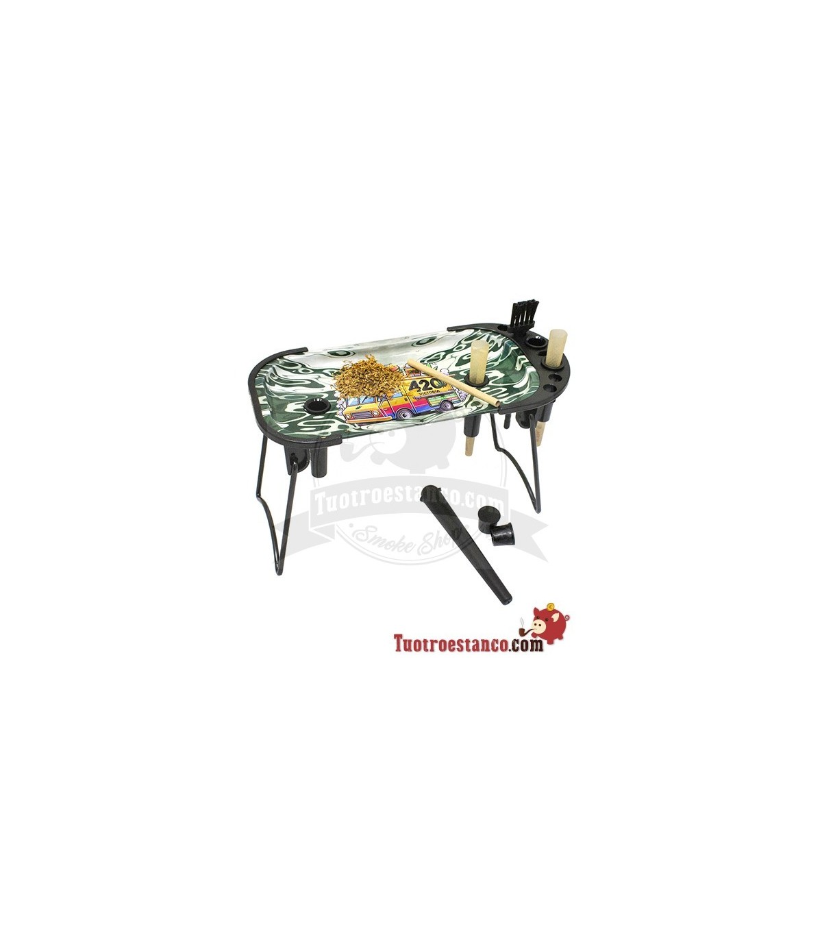Pero hay más en esta bandeja de lo que parece. No es solo una simple bandeja; es un kit completo diseñado para el fumador donde podrás rellenar 2 conos de forma rápida gracias a sus dos orificios. Dispone de 2 patas plegables que hacen más cómodo su manejo para transportar donde quieras.