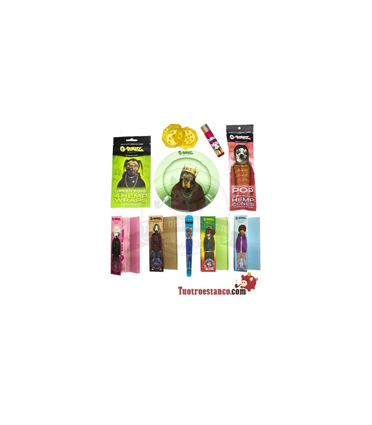 Pacchetto greengo 1x macinabiscotti 3D da 50 mm. 1x Coni greengo 6 unità 1 1/4. 1x Accendino verde. 4 carta greengo sottile king size. 2x Filtri in cartone greengo.
