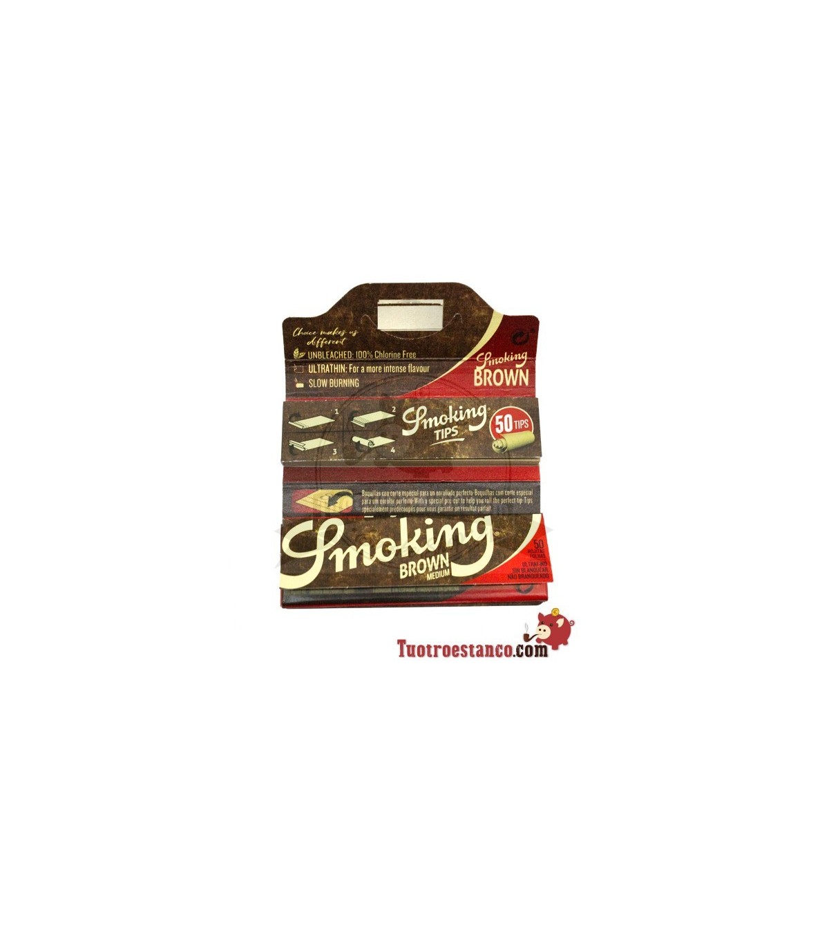 Papel Smoking marrom 1 1/4 78mm Características: - É um papel ultrafino com alto nível de transparência. - Com goma vegetal 100% natural. - Garante melhor colagem em uma única passagem. - Sem cloro. - Sem corantes...